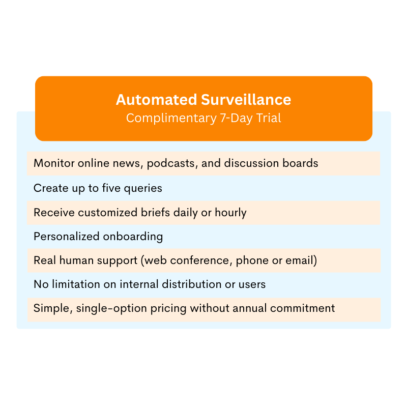 Our AI-powered surveillance starts with one of our expert analysts programming and optimizing your queries for you. This allows for filters and features not available on competing software interfaces. The result is an automated brief that has the look and feel of a human-curated brief, saving you time, frustration and budget.